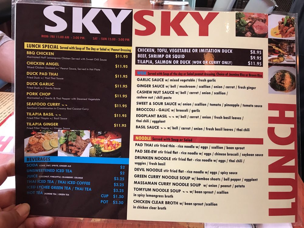 Sky Thai is a Thai restaurant located in Jersey City, offering a wide range of menu items. From appetizers like Crispy Fried Tofu and Chicken Satay to Chef's Recommended Lunch Specials such as Duck Pad Thai and Seafood Curry, there is something for everyone. The restaurant provides a casual dining experience with options for outdoor seating and happy hour specials. Customers have praised the flavorful dishes, with Joseph G. noting the excellent Pad Thai and Tiffany C. enjoying the lunch specials for delivery. Selena Y. described Sky Thai as a solid spot for a quick, no-frills meal, emphasizing the hot and flavorful Pad See Ew. With a diverse menu, vegan and vegetarian options, and efficient service, Sky Thai is a must-visit for Thai cuisine enthusiasts in the area.